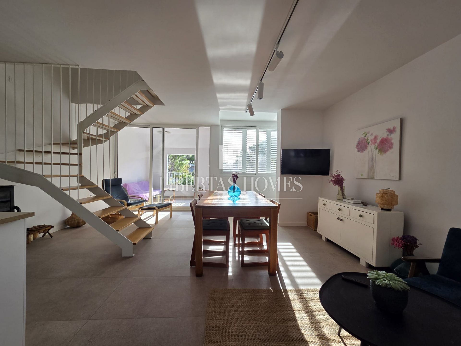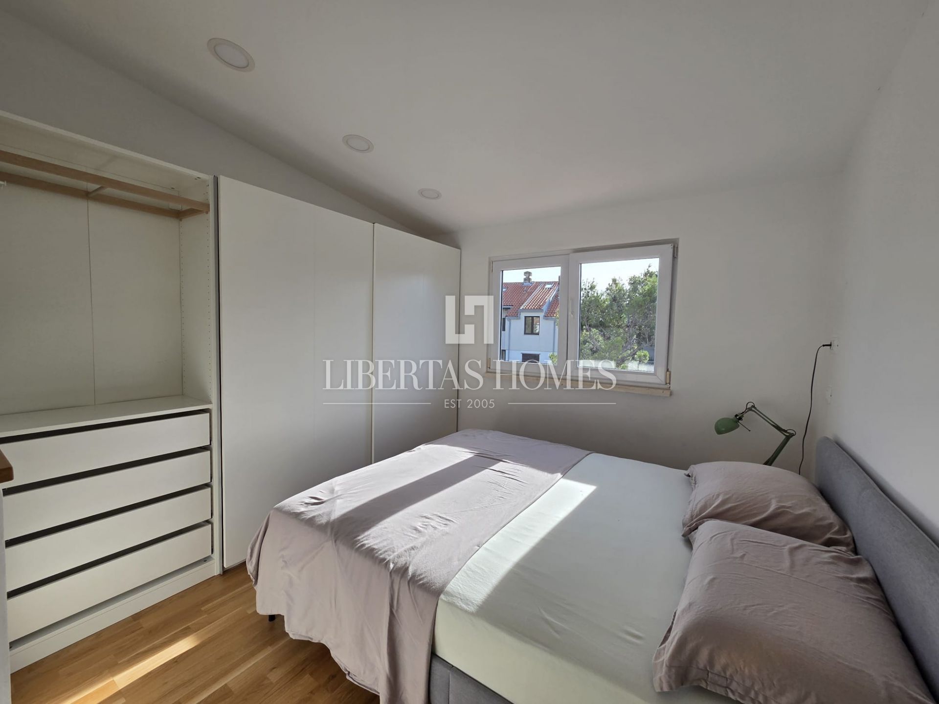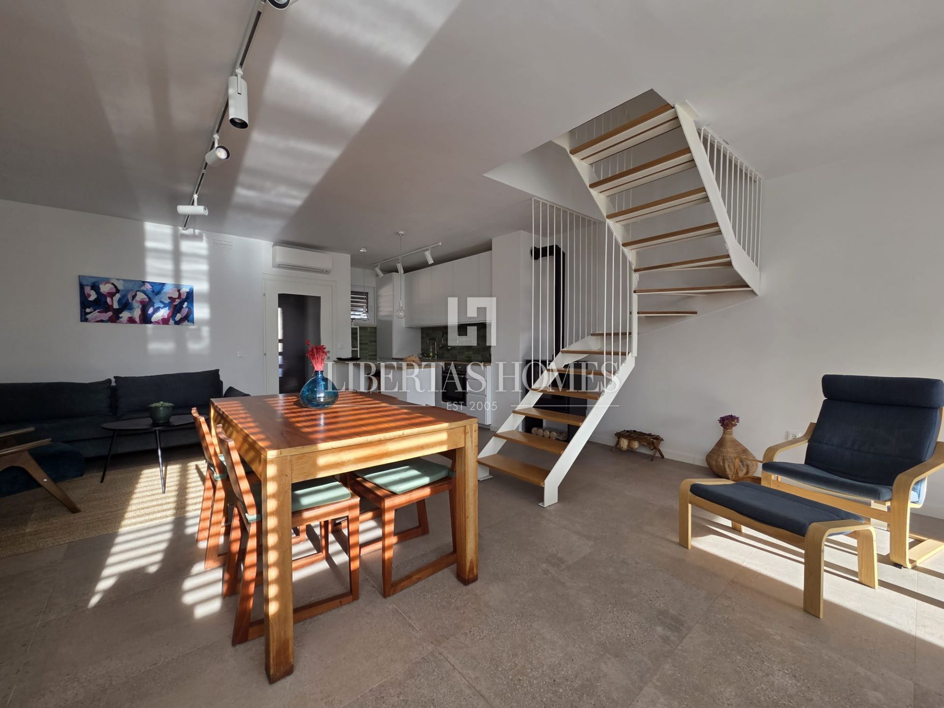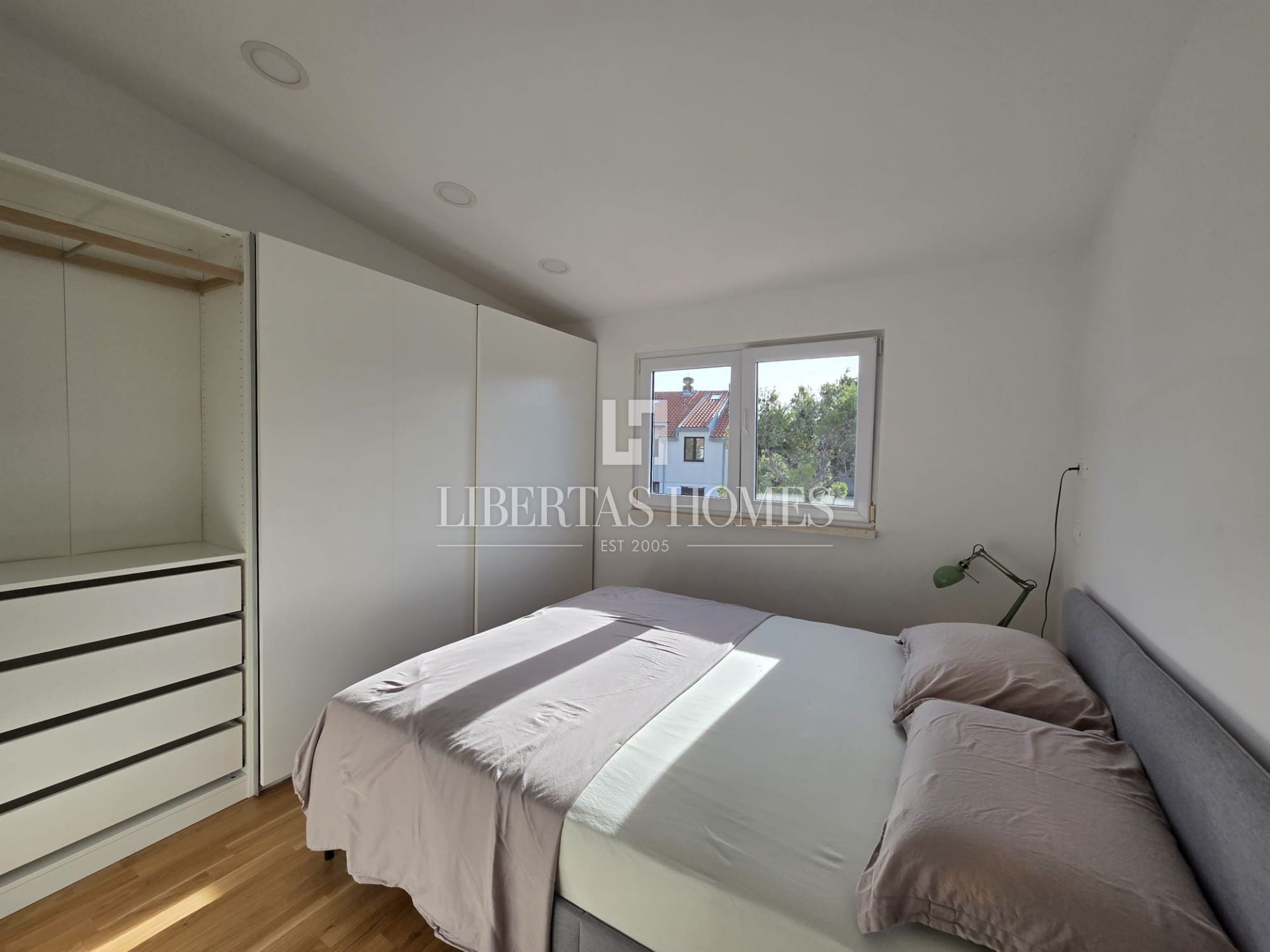 The interior layout is highly functional and well-organized. The apartment features a spacious open-plan living area that seamlessly connects the living room, kitchen, and dining area, while two comfortable bedrooms are located in the attic. The attic adds extra value to the property, creating a sense of warmth and openness, while abundant natural light further enhances the welcoming atmosphere throughout the apartment.